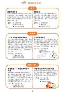 医療費助成:ひとり親家庭等医療費助成、小児医療費助成(所得制限なし)など。